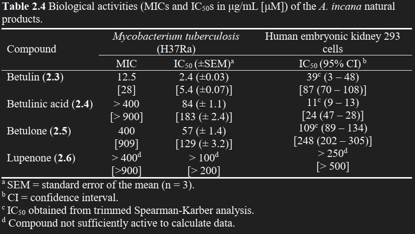 "In conclusion, the isolation of anti-mycobacterial triterpenes from extracts of the bark of A. incana may support the traditional medicinal use of this plant by the First Nations peoples of Canada as a treatment of TB-related symptoms. Betulin (2.3) demonstrated significant activity in our anti-mycobacterial assays and it is interesting to note that birch bark (trees of the genus Betula), which also contains significant quantities of 2.3 (Krasutsky, 2006), has numerous documented therapeutic uses in North America that include the treatment of pulmonary aliments and TB (Moerman, 1998). The acute differences in the anti-mycobacterial activities observed for the four structurally related triterpenes presents some preliminary structure-activity data and suggests the functionality at carbons 3 and 28 of the lupane skeleton are critical for activity, although further SAR studies would be required to confirm these data." (Haoxin,Li,2010)