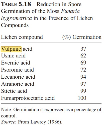 "The growing tips, therefore, produce copious amounts of toxic vulpinic acid in response to predation. Soredia, the vegetative reproductive bodies of L. vulpina, are also protected by large amounts of the compound; three samples of soredia from different populations contained 8.5, 9.8, and 14% vulpinic acid by air-dried weight. The same soredia contained 0.12, 0.006 and 0.11% atranorin, respectively. Vul- pinic acid is known to have some anti-bacterial properties [7], but these are probably second- ary to its anti-herbivore function." (stephenson1979)
