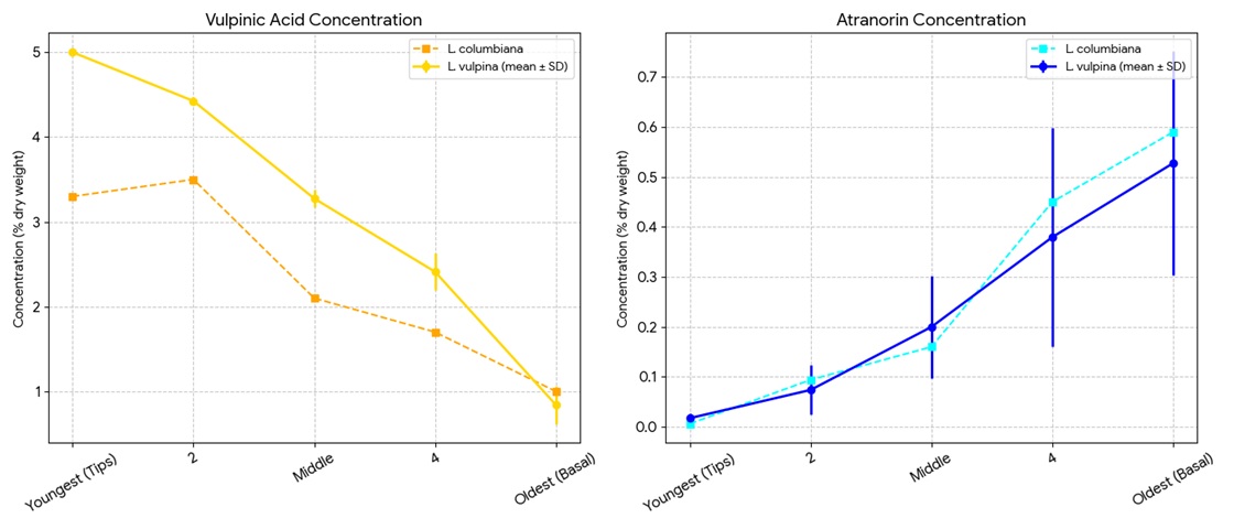 Table 1: Concentration of vulpinic acid and atranorin in various stages of thallus growth, as reported in two Letharia Sp.. (stephenson1979)