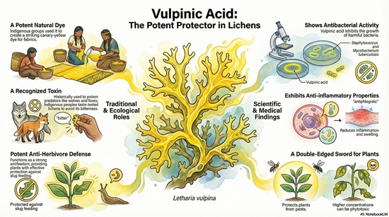 The function of vulpinic acid as a photoprotective agent in lichens like Letharia vulpina (Wolf Lichen) is well-supported by recent physiological and chemical research. Studies demonstrate that this pigment specifically targets high-energy blue light and UV radiation to prevent damage to the lichen's photosynthetic partner.(Phinney et al. 2018)