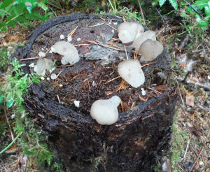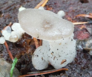 - Habitat: "on rotting wood or on the ground under conifers, (Phillips), "solitary to crowded-cespitose, also in rows or clusters, in damp shady places on path and street sides, as well as under shrubbery and in forests, commonly on old wood-processing places, on the soil, but usually in association with buried rotten wood, prefers limy soils", (Breitenbach), in damp ground on rotting wood, often under Douglas fir, (Ammirati), on conifers: needles and rotten wood, very rotten wood, litter, saprophytic on ground, (Ginns), single or more commonly crowded-cespitose in duff, soil and rotten wood under conifers, late summer and fall, rarely spring, (Castellano)" [E-flora-7]